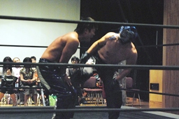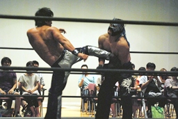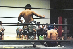HARASHIMAも応戦(左写真)。ミドルキックが鉄柱を誤爆。
