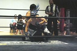 カウント2で返されると足取ってヒザ十字に(右写真)、HARASHIMAロープ。