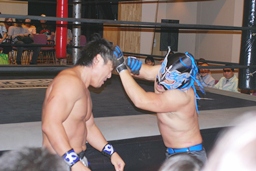 ロックアップ、アズールバック取る、ヘッドロック、HARASHIMA切り返してヘッドロック、アズールロープに振ってショルダーブロックの打ち合い(左写真)。アズールロープに飛ぶ、HARASHIMAキチンシンク。