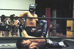 アズールはヒザにフィストドロップ、レッグドロップ。メディオ・カングレホ(右写真)。