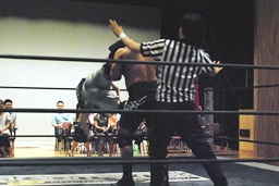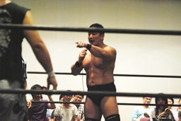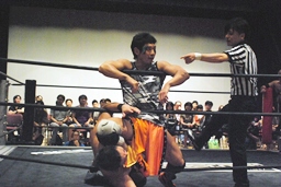 首投げからチンロック。リリースするとロープに振ってバックエルボー(右写真)、カウント2。高木にタッチ。