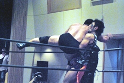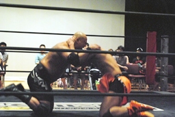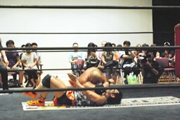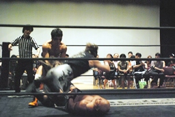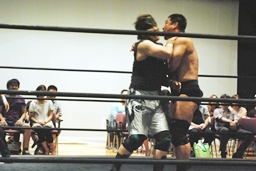 先発は高木とウラノ。高木「お前がAか。」客席からは「A」コール。ロックアップ、ウラノヘッドロック、高木ロープに振ってショルダーブロックの打ち合い(右写真)、