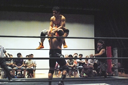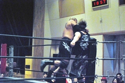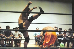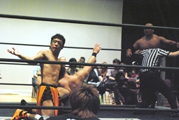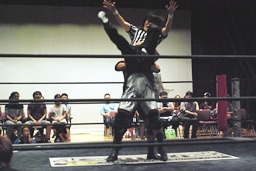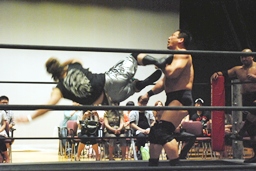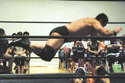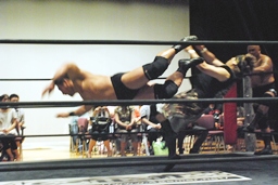 高木もドロップキック打ち返す(右写真)。ストンピング、相島にタッチ。ウラノは相島をコーナーに押し込んで高梨にタッチ。