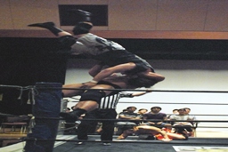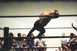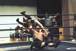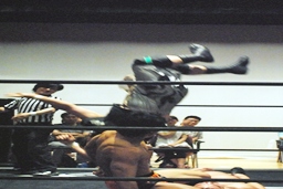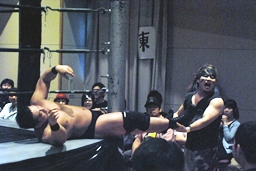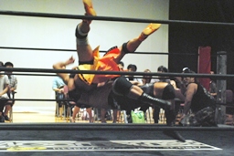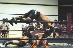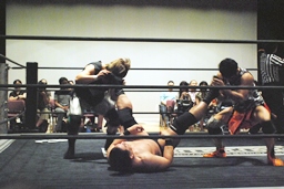 高木は2人をコーナーに振って肩に担ぐと2人まとめてバックフリップ(右写真)、相島にタッチ。