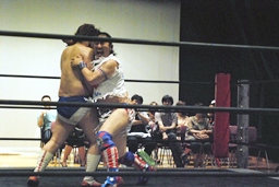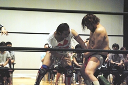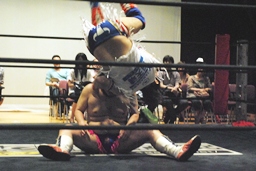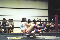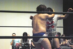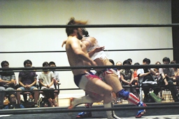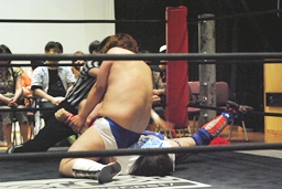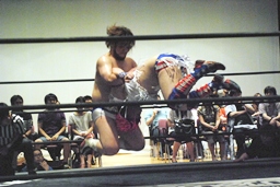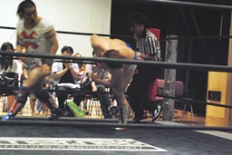 博多エルボー(モツ鍋、山笠、武田鉄矢!)決まる(右写真)。カウントは1。10分経過。