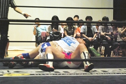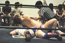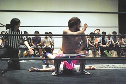 男色ドライバー(右写真)、木曽レフェリーようやく復活、しかしカウントが遅く2カウントどまり。