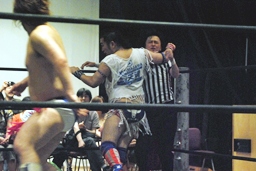 木曽レフェリーがディーノとターンバックルに挟まれる。ばってんボンバーが木曽レフェリーに誤爆(右写真)。