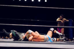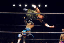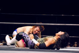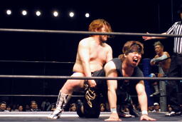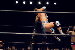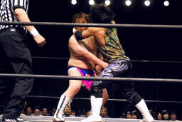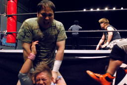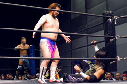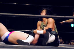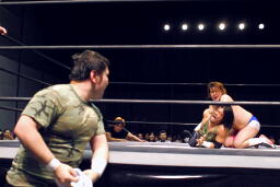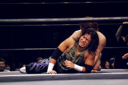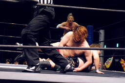 ウラノツームストーン狙う、大石ブロックしてスタナー(右写真)、しかしタッチは阻止される。ウラノは佐々木にタッチ。