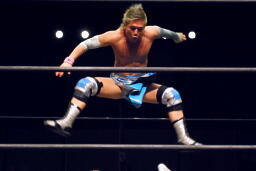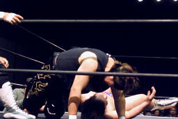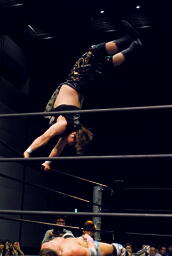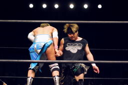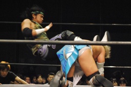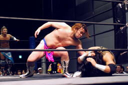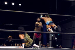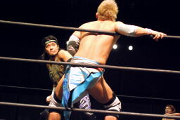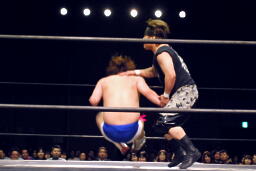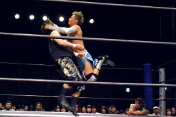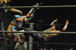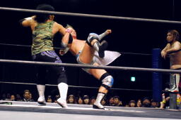 佐々木腕にエルボースタッブ、レッグドロップ入れて十字に(左写真)。ウラノにタッチ。5分経過。