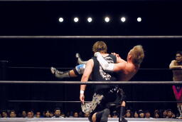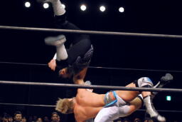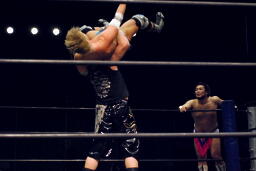 バックドロップ(左写真)はディーノがカット。佐々木がディーノを場外に出す。
