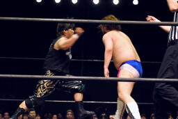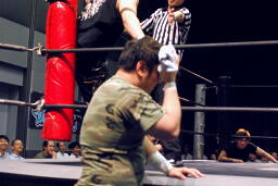 大石エルボー、ウラノはボディにパンチ(左写真)。佐々木にタッチ。10分経過。