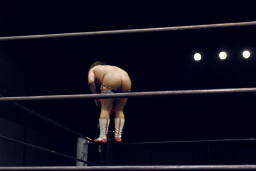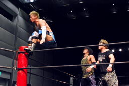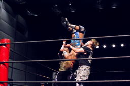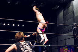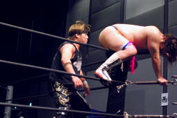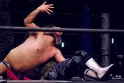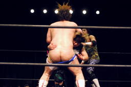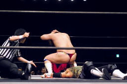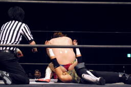 ウラノがパンチ、ディーノ佐々木の顔面に座る(左写真)、カウント2。