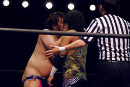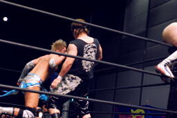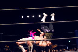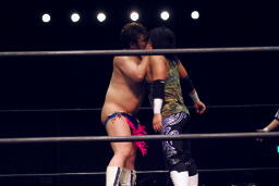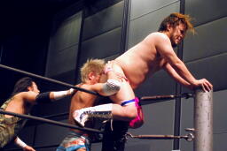 ロープに振ってウラノがマンハッタンドロップ(左写真)、