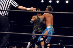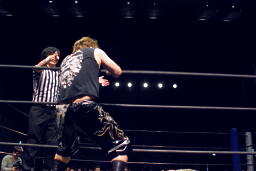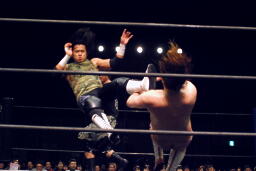 佐々木がドロップキック(右写真)、カウント2。15分経過。