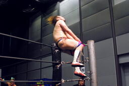 ディーノがリバースえび反りジャンプ狙ってコーナーに立つ(左写真)、