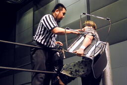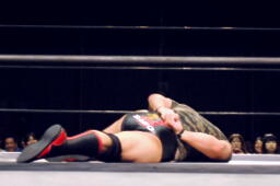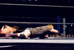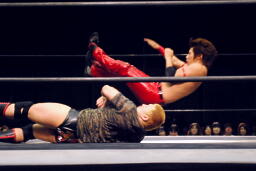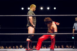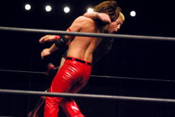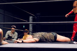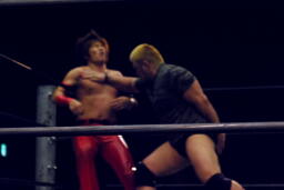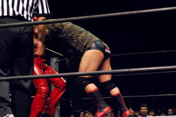 ロックアップ、火野ロープに押し込む(右写真)、ブレーク。再度ロックアップ、火野コーナーに押し込む、高尾切り返す。