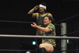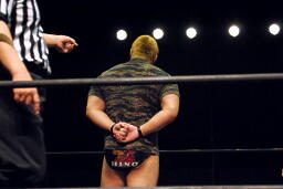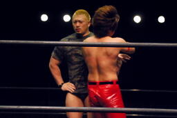 一旦控室に戻った火野だが新しいアーミーシャツを着てしれっとリング復帰、高尾にベリートゥベリー、逆水平(右写真)、ボディスラムからセントーン、カウント2。