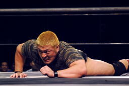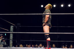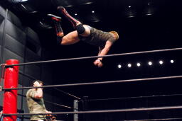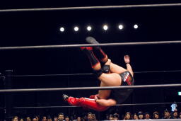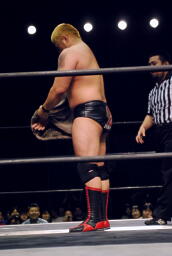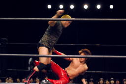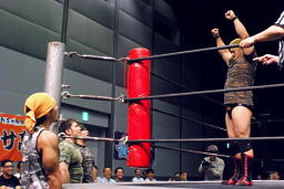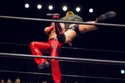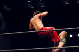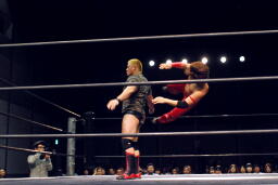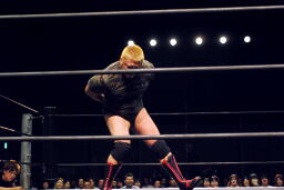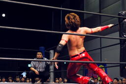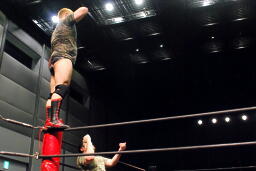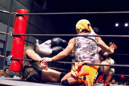 高尾コーナーに上ってミサイルキック(右写真)、カウント2。
