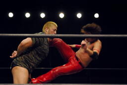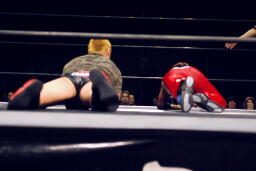 高尾顔面ドロップキック、フェイント入れてもう一発(左写真)、カウント2。