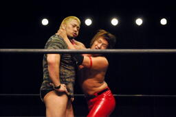 火野がコーナーに上る。アントンが「ロケットランチャー!」と号令、火野が敬礼(右写真)。