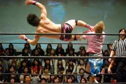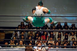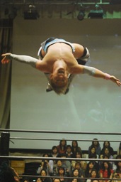 石井がボディスラム、入江コーナーに上ってダイビングボディプレス(左写真)、カウント2。