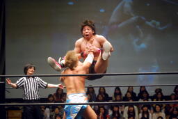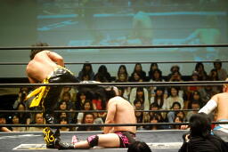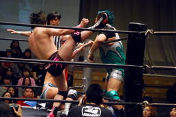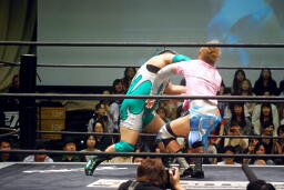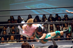 コーナーに振って串刺しエルボー、KUDOを抱え上げて入江の頭に落とす(左写真)。石井フィッシャーマンバスター、大石カット。入江が大石に突っ込む、大石がロープを引き下げてエプロンに出す。