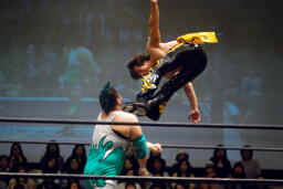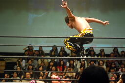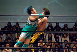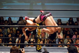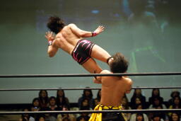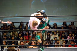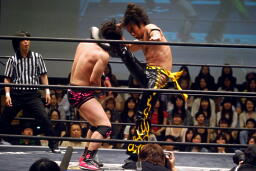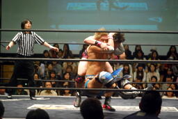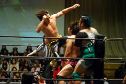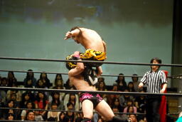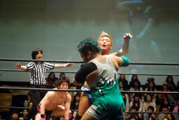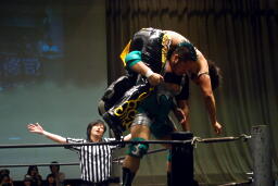 入江ロープでチョーク、大石パンチ、入江エルボー、大石ロープに飛んでクロスボディ、入江キャッチしてブラックホールスラム(右写真)、KUDOがカット。