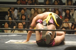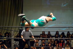 石井ソバット、オーバーヘッドキック(右写真)、ダブルアームDDT、カバーは大石がカット。石井は大石を場外に。
