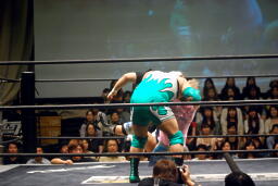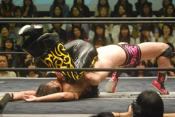 入江肩に担ぐ、大石着地してスタナー(右写真)、ボディスラム、入江ブロック、大石なんとか投げてKUDOにタッチ。