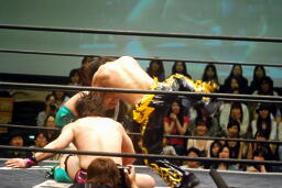 KUDO雪崩式回転エビ固めに(左写真)、入江こらえる。大石がエプロンからドロップキック、入江エプロンに落下。