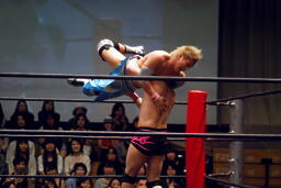 KUDOボディスラム、コーナーに上る。大石が入江に絶品狙うが入江は足を引っ張って阻止(左写真)。