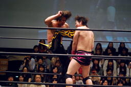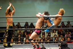変形のマフラーホールド(右写真)、さらに石井がキック、ジャンピングニー。入江がカバー、カウント1。石井にタッチ。