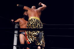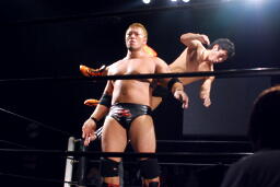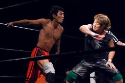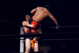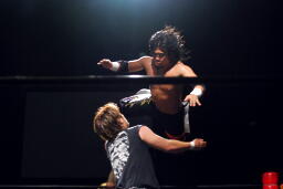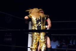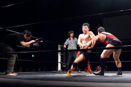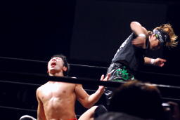ウラノ逆水平(右写真)、高梨もチョップ。バックの取り合い、高梨がロープに押し込むと佐々木がロープスタナー。高梨は星誕期にタッチ。