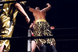 星誕期は火野のボディにフライングヘッドアタック(左写真)。これも豪快。佐々木にタッチ。