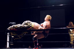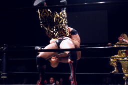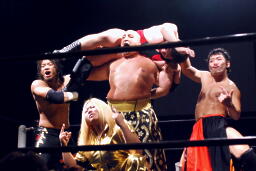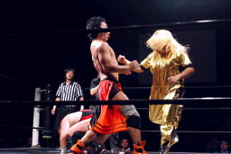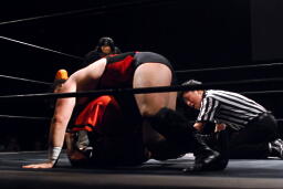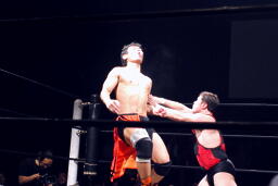 火野ボディスラム2発、抱え上げてミリタリースラム(右写真)。火野チョップ、高梨かわしてサミング。火野はウラノにタッチ。