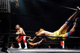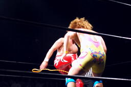 宮原は福田を花道に上げて客席へのブレーンバスター狙う、福田ブロックしてDDT(右写真)。