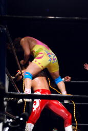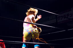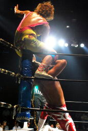 コーナーに上ってダイビングフィストドロップ(左写真)。