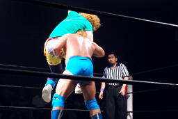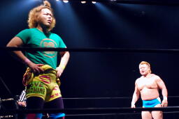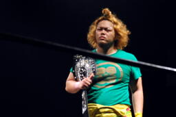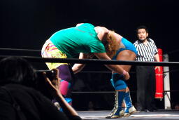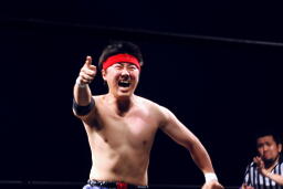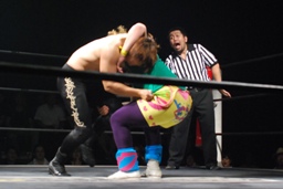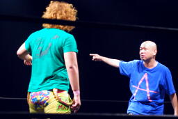 福田がアイアンマンのベルトを肩に掛けて入場(右写真)。福田は10人の精鋭に対しパーフェクトプレックスを決めなければ(3カウントを取る必要はなし)今日新木場から帰れないというルール。福田にとっては前試合がアイアンマンヘビーメタル級の防衛戦でもある。