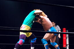風戸コーナーに上る、福田立ち上がって下からパンチ、ホールドして(左写真)、