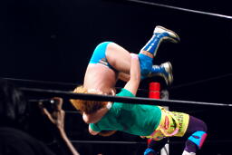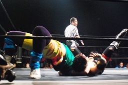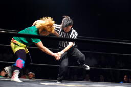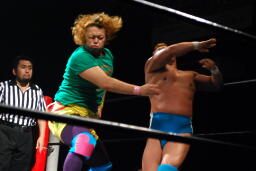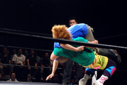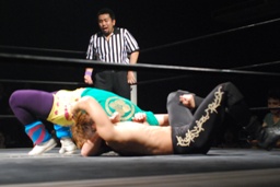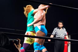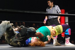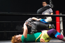 松永バックドロップ(右写真)、ラリアット、カウント2。