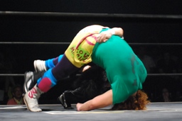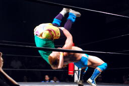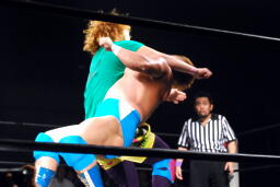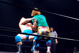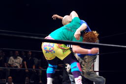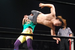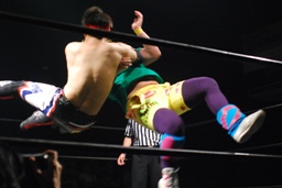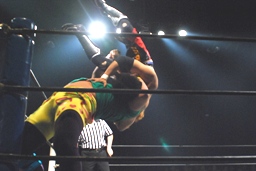 松永ロープに飛ぶ、福田キャッチしてマンハッタンドロップ(右写真)、