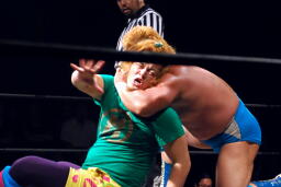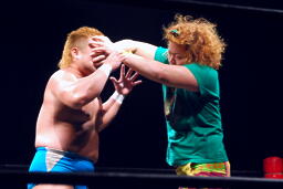 再度ロックアップ、今度は福田がロープに押し込む、ブレークすると松永が張り手(左写真)。