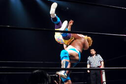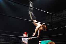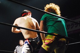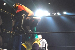 5人目遠藤哲哉。コーナーに振って串刺しエルボー、ドロップキック(右写真)。