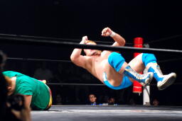 ボディスラムからムーンサルトプレスは福田かわす(左写真)。