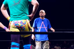 3人め、流れる入場テーマはモーニング娘。の「恋愛ハンター」。誰だ?と思ったらギャングスター会場こと音響の会場さん(右写真)。