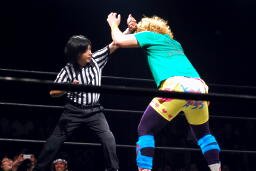 4人め、全女のテーマが流れる。出てきたのは木曽レフェリー(右写真)。伊藤薫か。