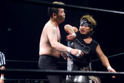 新藤ヘッドロック(左写真)、ウラノはストマッククローでブレーク。エルボードロップからカバー、カウント2。