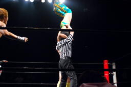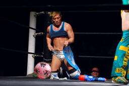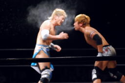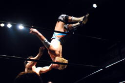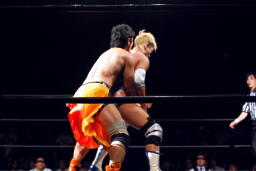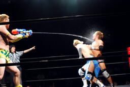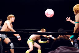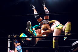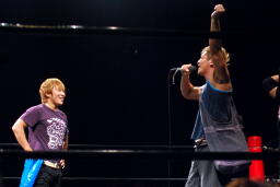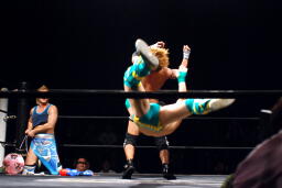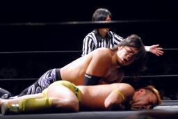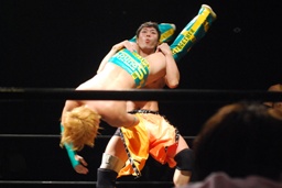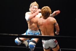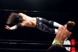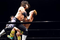 ロープに振る、大石切り返してフライングフォアアーム(左写真)。佐藤スイングDDT、カウント2。