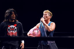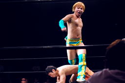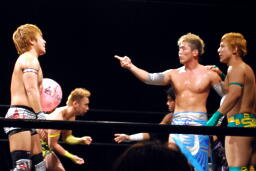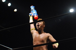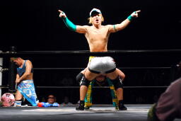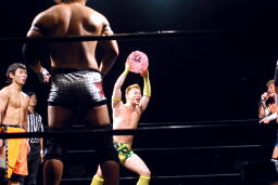 大石にトリプルドロップキック(右写真)、カバーは佐々木とオースギがカット。