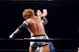 千賀立ち上がってロープに振る、佐々木ショルダーブロック(右写真)。